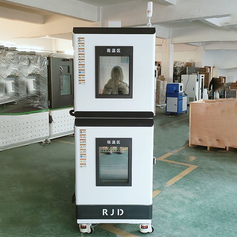 Product application The high and low temperature shock test chamber is used to test the extent to which materials can withstand continuous environments of extremely high and low temperatures in an instant, so as to detect the physical changes caused by thermal expansion and contraction of the samples in the shortest time. It is applicable to the adaptability tests of simulation specimens in the material industries such as metals, plastics, rubber, electronic and mechanical products, aerospace, energy materials, medical chemicals, etc. under the conditions of rapid changes in the surrounding atmospheric temperature, and provides reliability tests for the safety tests of electronic components Features 1. Pneumatic control is adopted, and the basket switches and moves between high and low greenhouses. 2. Short conversion time, short temperature recovery time, and fast temperature change speed 3. It adopts the two-box method, with a new generation of appearance design. The overall structure is compact and the volume is small, which improves the temperature uniformity in the working chamber. 4. It can be used not only for thermal shock tests but also for high-temperature or low-temperature tests alone. 5. It is equipped with high-end universal rollers for easy movement within the laboratory. 6. Vacuum double-layer heating observation window with built-in lighting. 7. Multiple data interfaces, SD card storage, USB output, and remote operation via a computer APP. Technical parameters 1. Effective volume of the basket: 27L 2. Specifications and dimensions: Outer width, depth and height: 750×2100×1900mm, inner width: 520×600×600mm 3. Basket size: 300×300×300mm 4. High-temperature pre-temperature range: 60℃ to +180℃ 5. Low-temperature preheating range: -10℃ to -60℃ 6. Temperature shock range: -40℃ to +120℃ 7. Basket conversion time: ≤10 seconds 8. Temperature recovery time: ≤5 minutes 9. Temperature fluctuation: ≤±0.5℃ 10. Temperature uniformity: ≤2℃ 11. Temperature deviation: ≤±2℃ 12. High-temperature preheating time: 20℃ to 180℃≈30 minutes 13. Low-temperature pre-cooling time: 20℃ to -60℃≈75 minutes 14. Total power: ≈12kw 15. Operating power: ≈8KW Operating voltage: AC220 50Hz Specification, basket size, external dimensions 27L 300×300×300 750×2100×1900 80L 400×400×500 1200×2500×1800 150L 500×500×600 1500×2600×1850 210L 600×500×700 1700×2650×1900 510L 800×800×800 2500×3200×2100 1000L 1000×1000×1000 3000×3500×2100 The high-temperature pre-temperature range for temperature parameters is 60℃ to +200℃ The low-temperature preheating range is -10℃ to -80℃ The impact range is -40 ℃, -50 ℃, -65℃ to 120 ℃, 150℃ as required The temperature recovery time is no more than 5 minutes The temperature fluctuation is ≤±0.5℃ The temperature uniformity is ≤2℃ Temperature deviation: ≤±2℃ The movement mode of the basket is pneumatic The time for basket conversion is no more than 10 seconds Safety protection Leakage, short circuit, over-temperature, motor overheating, compressor overpressure, overload, overcurrent protection/controller power-off memory- Name(chinese)
